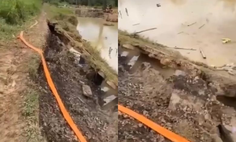According to reports, the miners are using a method known locally as “one leg” — a dangerous technique that involves using a large water hose and high-pressure pump to wash away soil after excavation with heavy machinery.