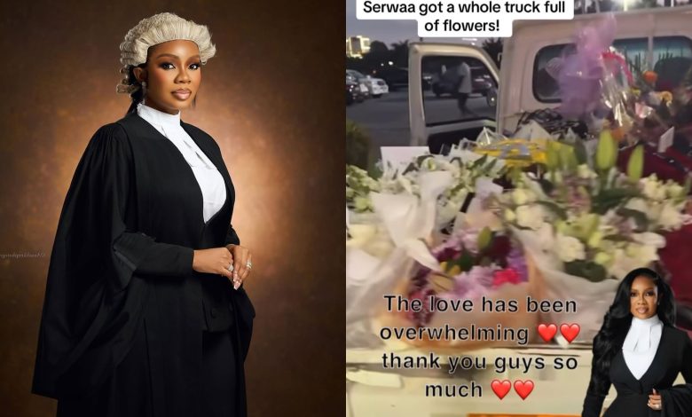 Ghana’s media sweetheart–turned–barrister, Serwaa Amihere, received the ultimate show of love and admiration during her Call to the Bar celebration — a whole truck filled with beautiful flowers.